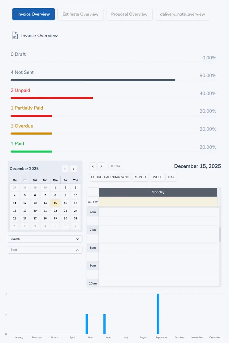 Behalten Sie den Überblick über Ihre Finanzen: QR-Rechnungen oder wiederkehrende Rechnungen können ganz einfach aus Projekten, Aufgaben, Kundentickets und vielem mehr erstellt werden. Sie können auch Ihren Mahnprozess automatisieren und bleiben über den Status jeder Rechnung informiert.